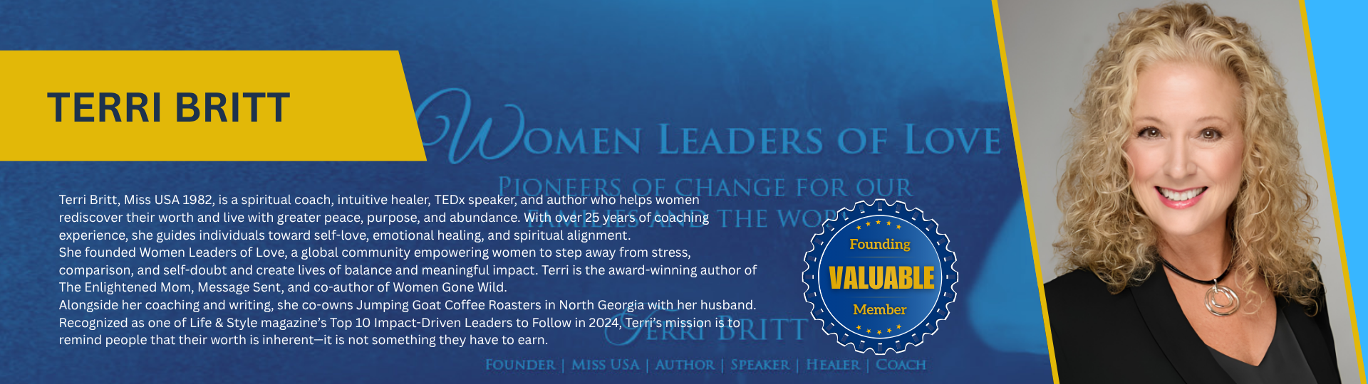 Beyond her coaching and writing, Terri is also a business owner with her husband, Charlie Britt, co-running Jumping Goat Coffee Roasters in the North Georgia mountains. Named one of Life & Style magazine’s Top 10 Impact-Driven Leaders to Follow in 2024, Terri continues to inspire audiences worldwide through her speaking, coaching, and teachings on worthiness, love, and conscious living.